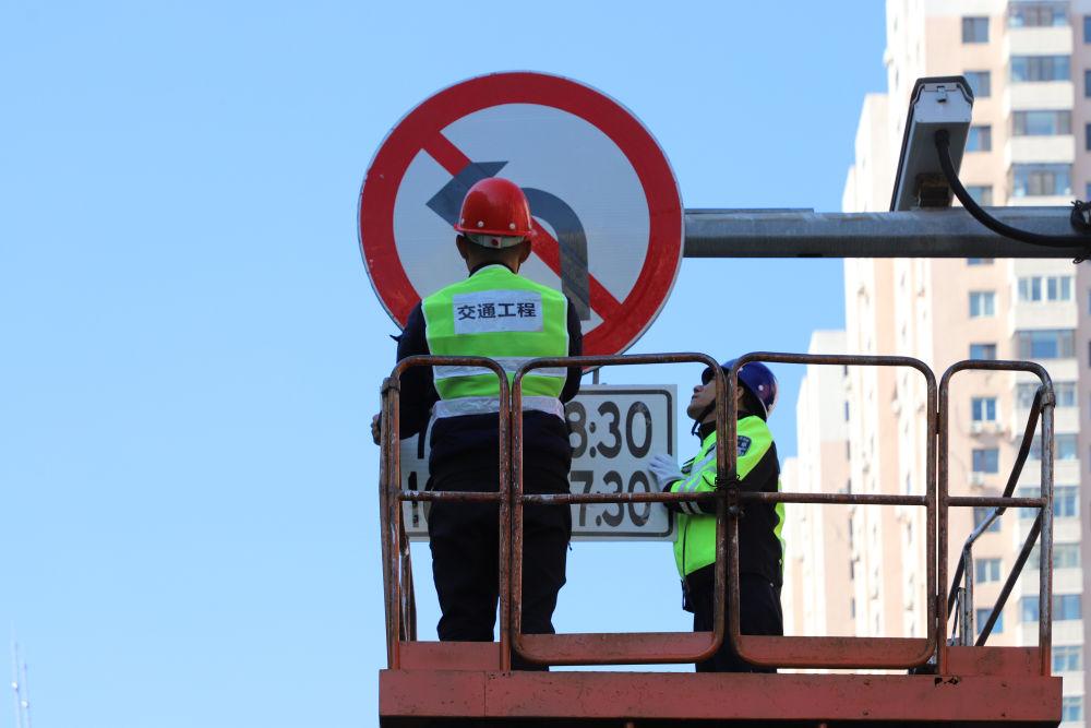 圖為本溪交警聯(lián)合相關(guān)部門對指示牌進(jìn)行安裝檢查。