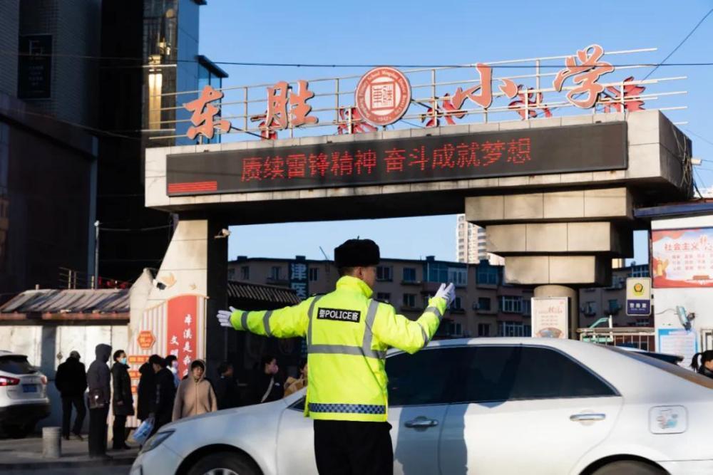 圖為本溪交警正在校園門口疏導(dǎo)交通。