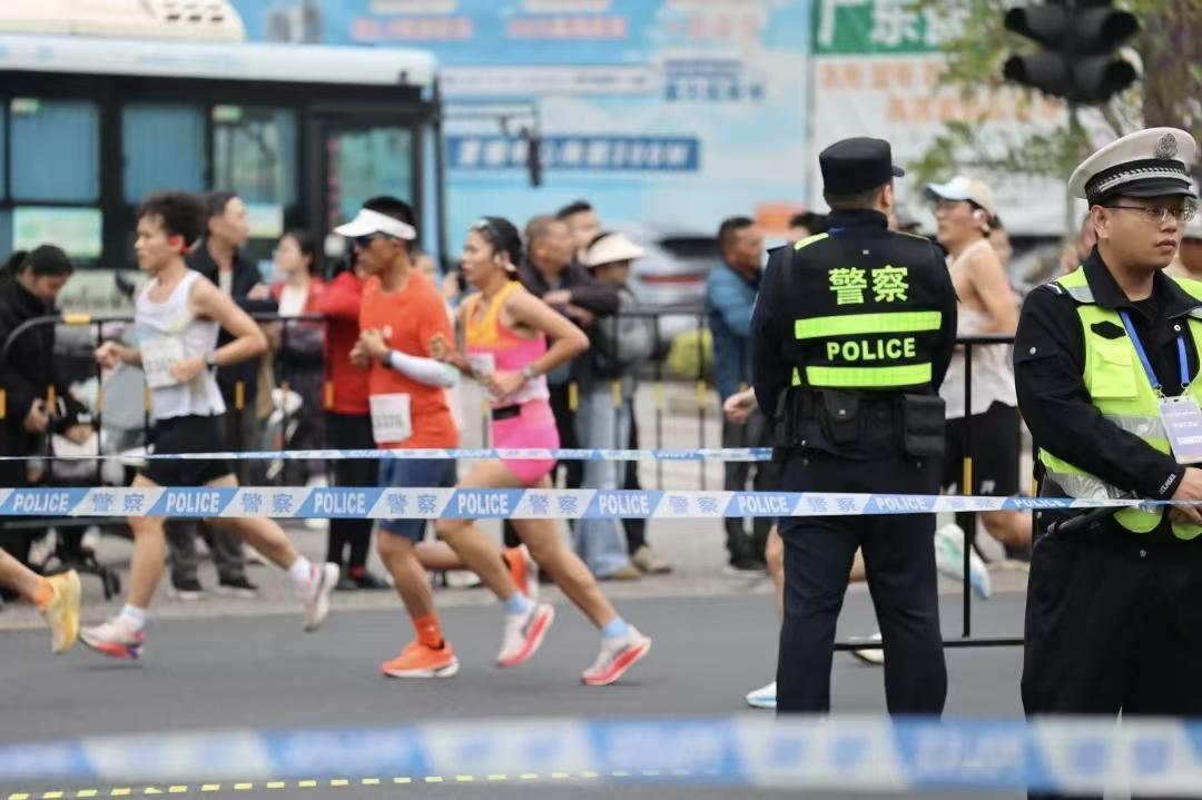 賽事過程中,民警們時刻關(guān)注選手狀態(tài),對突發(fā)抽筋、暈倒等情況的參賽選手第一時間實施緊急救助,以“溫情藍”守護每一位跑者的安全。