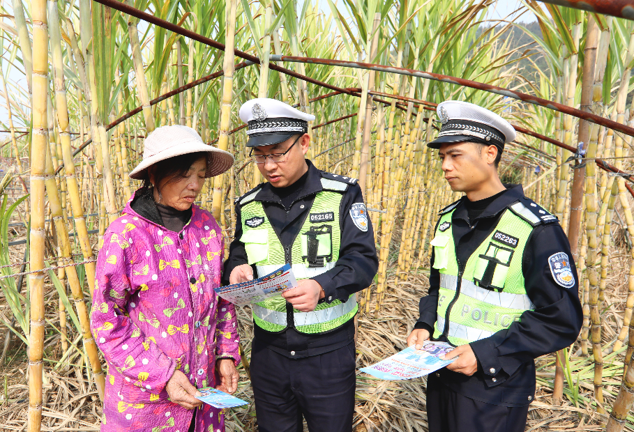 圖為12月16日,民警在鳳陽(yáng)鎮(zhèn)甘蔗種植基地向村民宣傳交通安全知識(shí)。