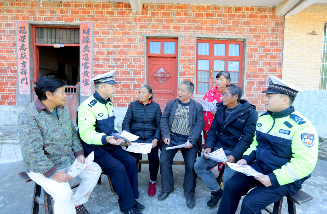 圖為1月14日,民輔警在鈐山鎮(zhèn)田心村向村民宣傳交通安全知識。