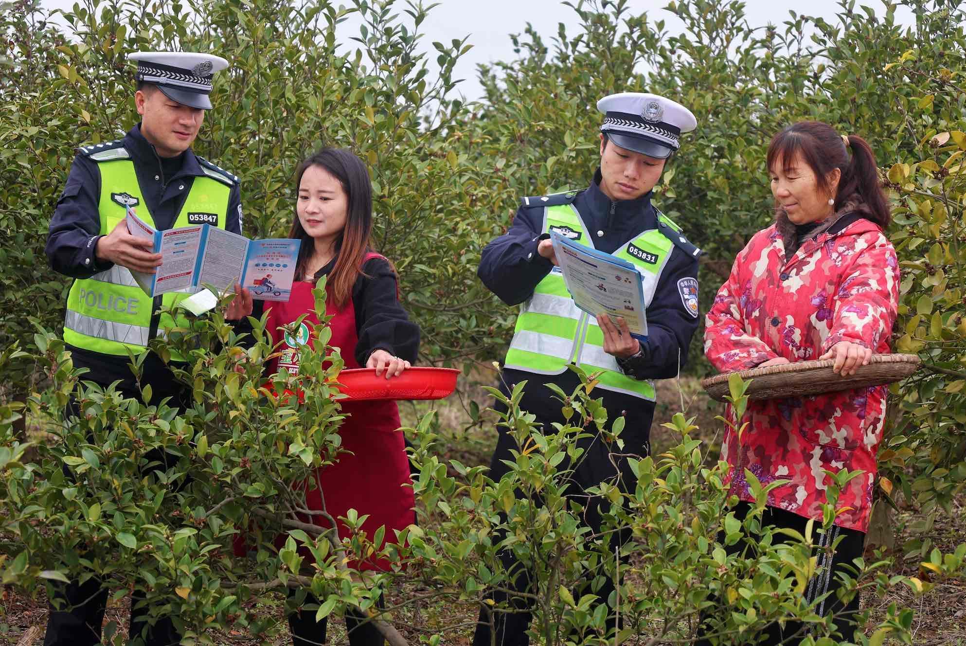 春耕時節(jié),交通安全尤為重要。3月19日,湖北省荊州市松滋市公安局陳店派出所交管中隊組織宣傳民警深入轄區(qū)油茶園,將交通安全知識送到采茶農戶身邊。
