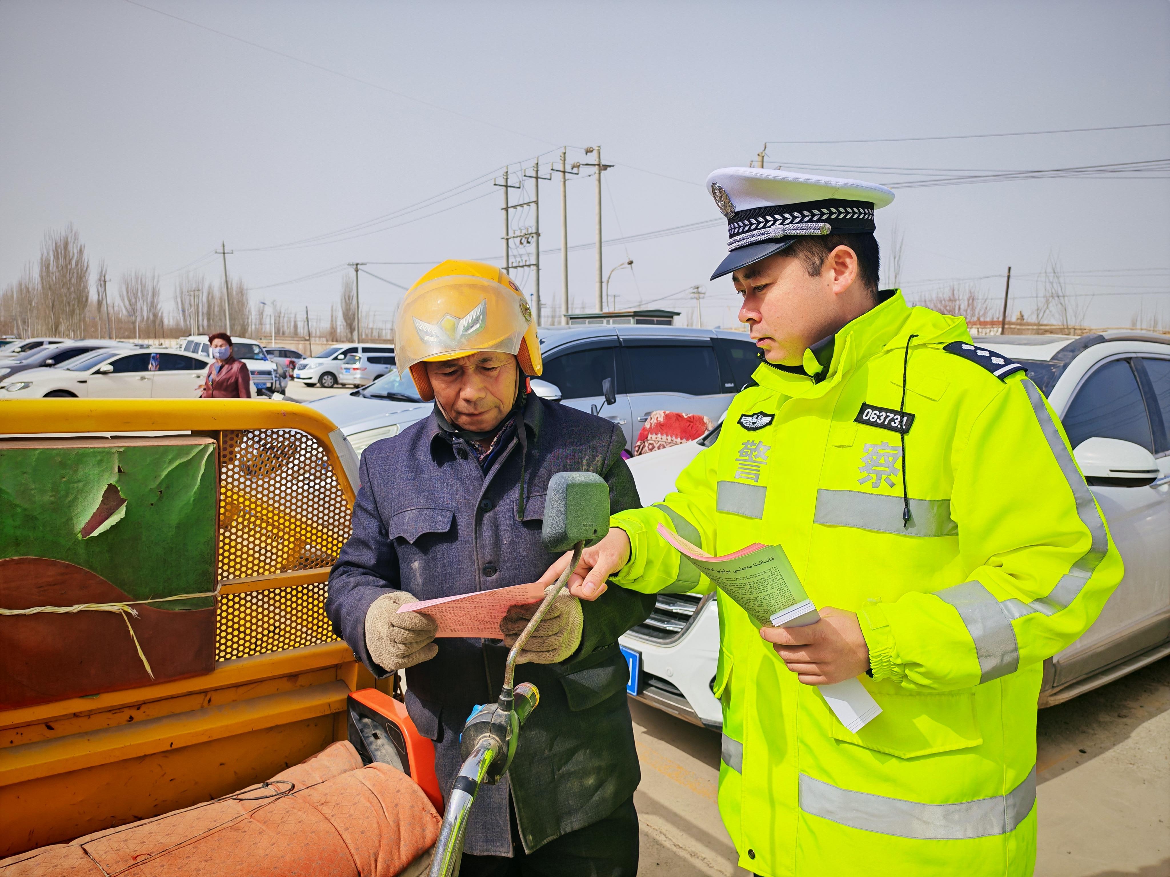 3月18日,正值新疆輪臺(tái)縣鄉(xiāng)村巴扎(集市)日,輪臺(tái)縣公安局交通管理大隊(duì)的民輔警借著趕集的人流,開(kāi)展了一場(chǎng)別開(kāi)生面的春季交通安全主題宣傳活動(dòng)。針對(duì)春耕期間農(nóng)村地區(qū)農(nóng)用車(chē)、摩托車(chē)出行頻繁的實(shí)際,民警緊扣群眾出行場(chǎng)景,結(jié)合本地真實(shí)案例,面對(duì)面講解農(nóng)用車(chē)違法載人、騎乘摩托車(chē)不戴頭盔、酒駕醉駕等行為的危害,讓交通安全知識(shí)在嘮家常中入腦入心。