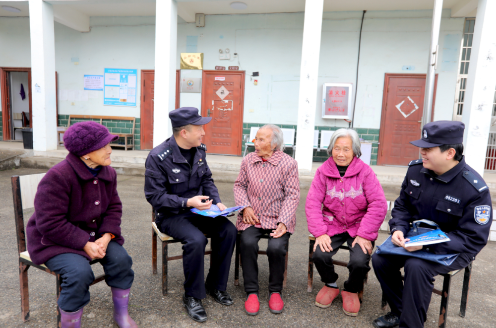 圖為3月22日,民警在鈐山鎮(zhèn)大坑村向老年人宣傳防范養(yǎng)老詐騙知識。