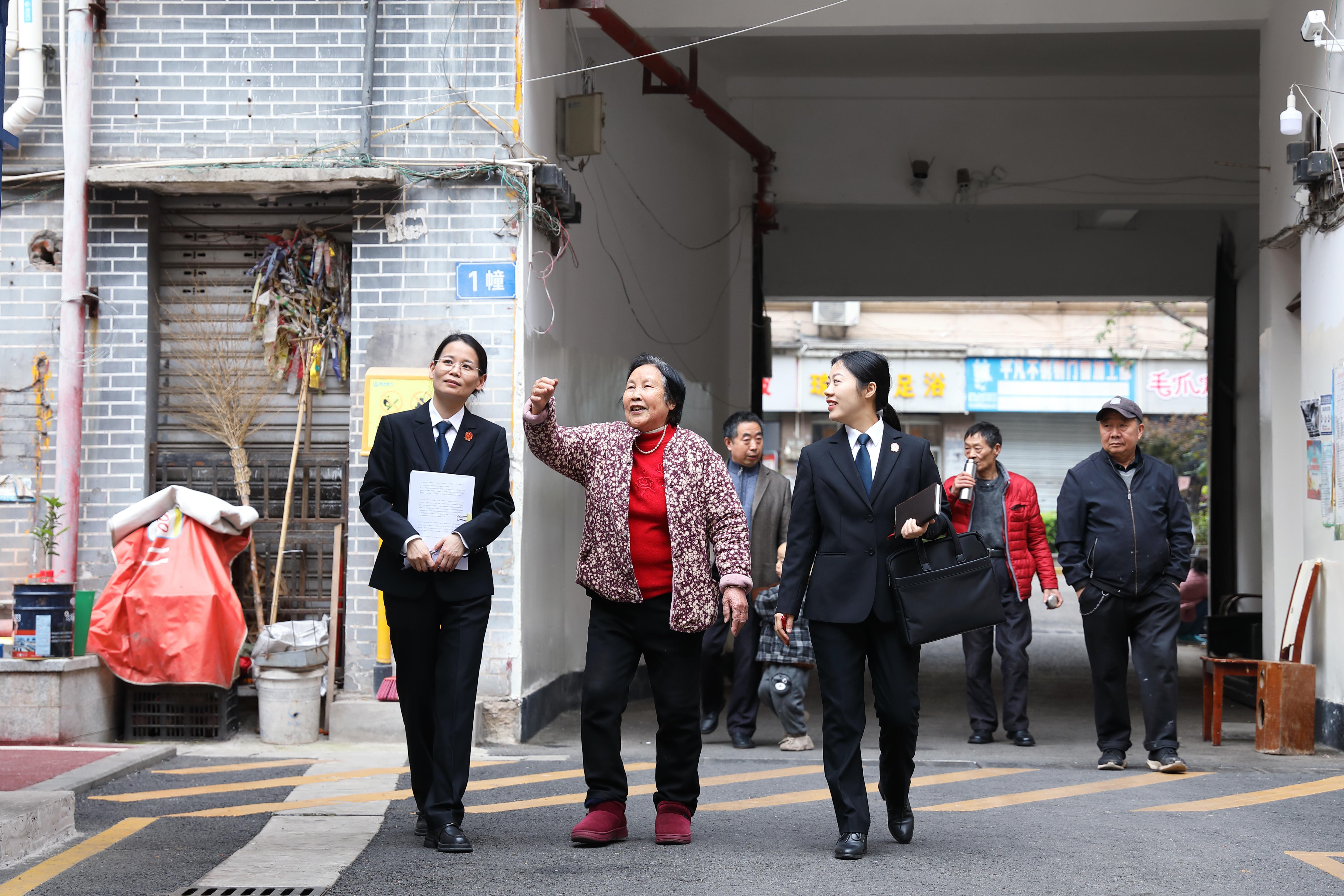 圖為法官圍繞加裝電梯的規(guī)劃位置等事項進行現(xiàn)場勘查。