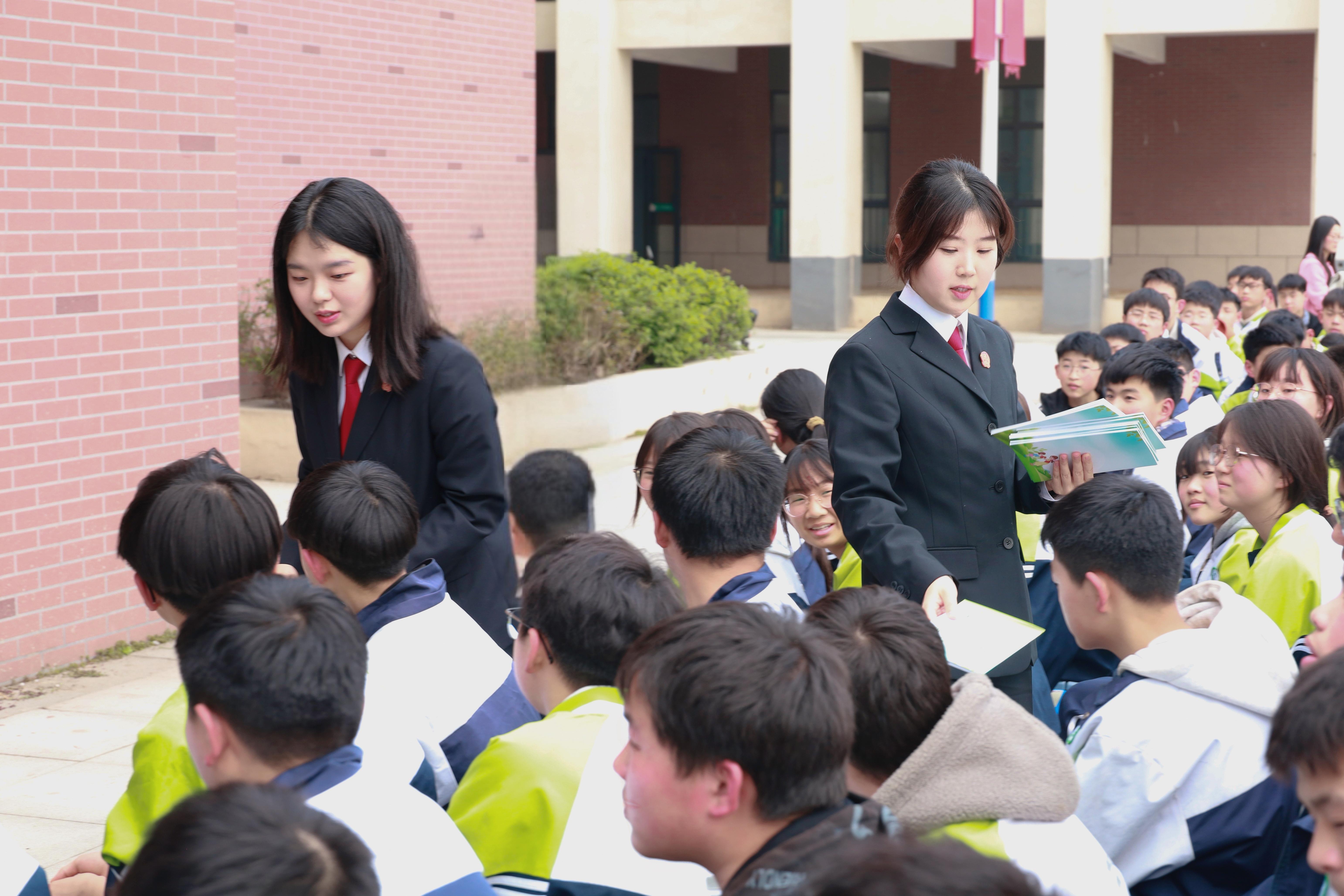 圖為3月25日,鄢陵縣人民法院法官向?qū)W生發(fā)放防范校園欺凌宣傳手冊。