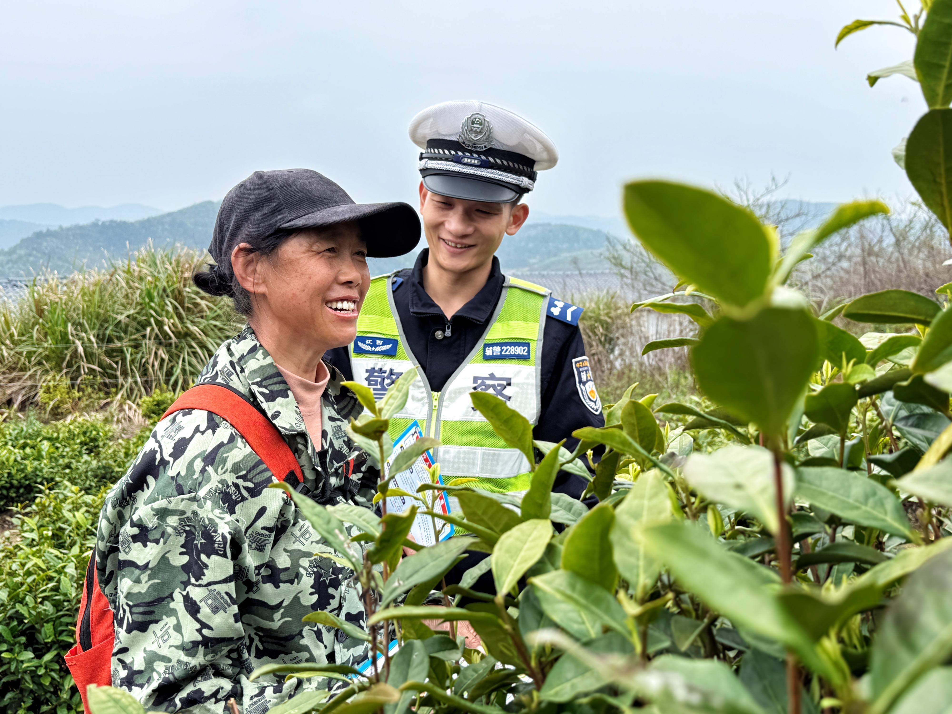 圖為4月7日,輔警在魯溪鎮(zhèn)雙新村英山茶場(chǎng)向茶農(nóng)宣講交通安全知識(shí)。