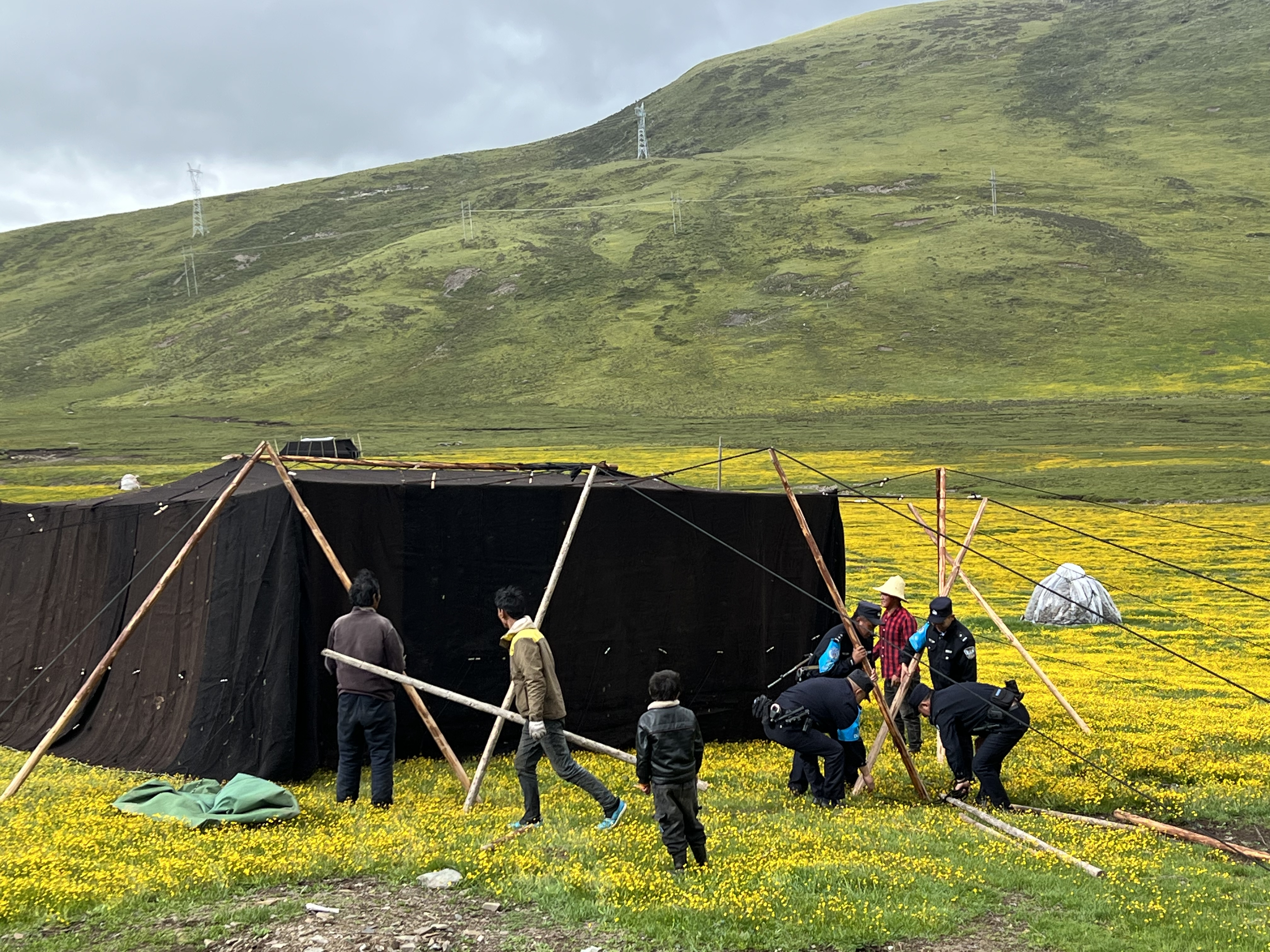據了解,這是夏季牧場轉場的最后一頂黑帳篷,在冒雨搭建半小時后,帳篷搭建完成,標志著整個安孜鄉(xiāng)夏季牧場轉場結束。這也是云端花海中的黑帳篷,邂逅盛德白玉最美的警民情。