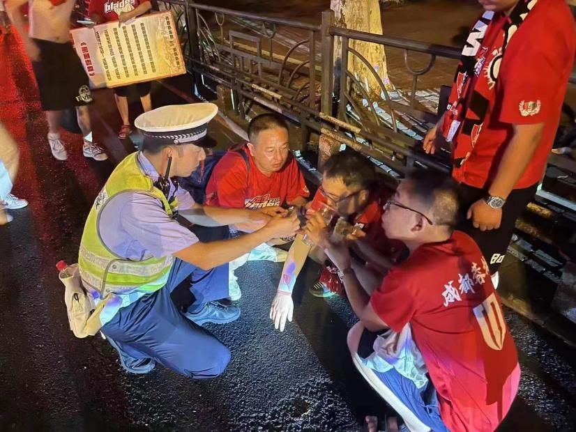 當(dāng)晚23時20分許,比賽結(jié)束后,樂山市公安局交警支隊直屬一大隊牛咡橋中隊交警馬濤和王飛仍堅守在市中區(qū)新廣場執(zhí)勤點巡邏執(zhí)勤,發(fā)現(xiàn)一名剛剛從擺渡車上下來的球迷突然摔倒在地。