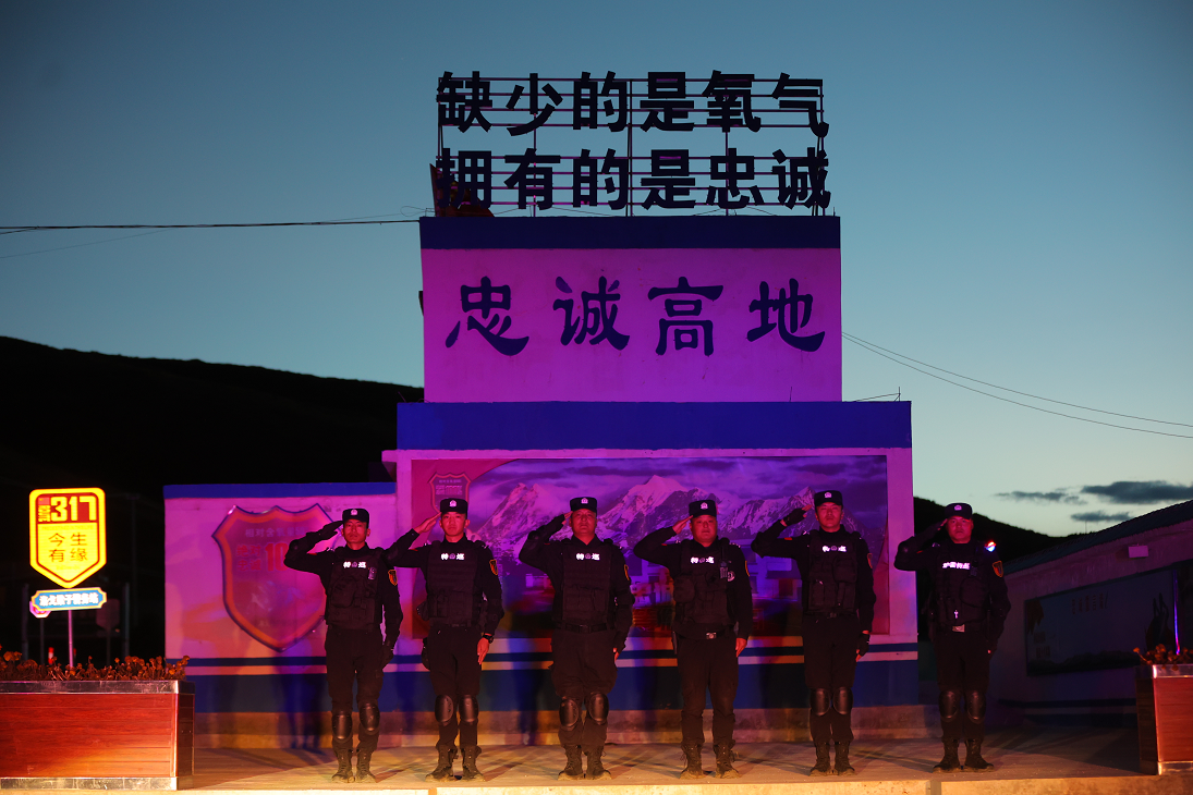當(dāng)爐霍衛(wèi)士遇見(jiàn)王城衛(wèi)士,忠誠(chéng)如山是他們共同的信仰。2023年10月15日傍晚,率隊(duì)到充古鄉(xiāng)執(zhí)行任務(wù)的楊進(jìn)前,任務(wù)完成空隙之際組織5名隊(duì)員前往3980米的洛戈梁子警務(wù)站,在夜空下聆聽(tīng)“忠誠(chéng)高地”上的故事。凡人微光,最是平凡。洛戈梁子警務(wù)站身處川藏線上的“紅色”山梁,與爐霍縣山水相連。楊進(jìn)前和“雷鋒”所長(zhǎng)劉鵬所長(zhǎng)系四川警院同學(xué),在工作中常有往來(lái),緊密協(xié)助。這些年,隨著“缺少的是氧氣、擁有的是忠誠(chéng)”在全州唱響,楊進(jìn)前時(shí)常被感動(dòng),更心生敬意。因此趁下鄉(xiāng)之際,專門帶領(lǐng)年輕戰(zhàn)友們赴洛戈梁子接受忠誠(chéng)的洗禮,汲取奮進(jìn)的力量。忠誠(chéng)印寸心,浩然充兩間。楊進(jìn)前相信,當(dāng)他們?cè)谝箍罩杏L(fēng)致敬的那一刻,當(dāng)紅藍(lán)閃爍中在忠誠(chéng)墻上映出忠誠(chéng)的身影時(shí),這是霍爾衛(wèi)士追光路上最美的偶遇,最強(qiáng)的感召。