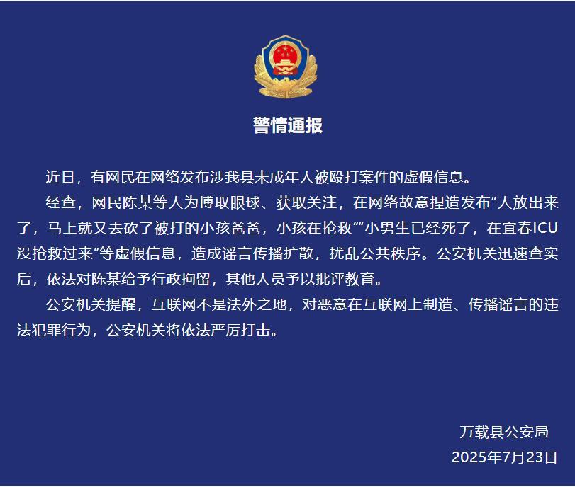 7月23日下午,萬載縣公安局發(fā)布警情通報稱,網(wǎng)民陳某等人為博取眼球、獲取關注,在網(wǎng)絡故意捏造發(fā)布“小男生已經死了,在宜春ICU沒搶救過來”等虛假信息,公安機關依法對陳某給予行政拘留,其他人員予以批評教育。