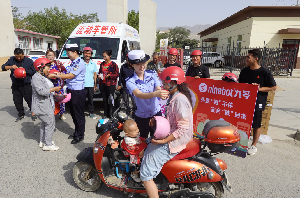為從源頭上消除交通安全隱患,全力確保騎乘電動自行車、摩托車的群眾佩戴國家標準安全頭盔,9月11日,新疆庫爾勒市公安局交通管理大隊車輛管理所民輔警聯合體檢中心的醫(yī)務工作者、電動自行車企業(yè)相關人員,通過“警醫(yī)企”聯動,采取“上門服務+交通宣傳”的形式,將“流動車管所”開到鄉(xiāng)村,深入街頭巷尾開展“頭盔‘贈’不停 安全‘戴’回家”車駕管業(yè)務和交通安全主題宣傳活動,并向群眾贈送帶有3C認證的國家標準安全頭盔。