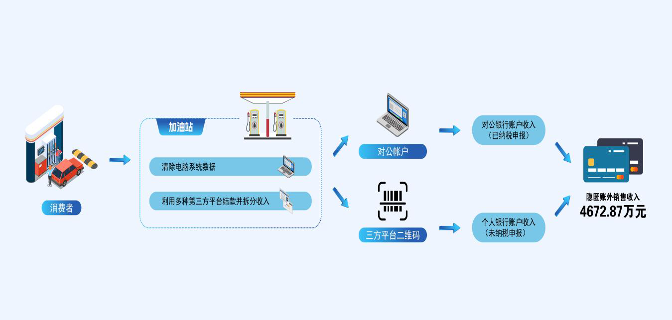 面對(duì)證據(jù),李長(zhǎng)龍仍狡辯稱是親屬間借款。檢查人員依法調(diào)取相關(guān)人員賬戶流水,再次比對(duì)支付時(shí)間、金額分布等數(shù)據(jù),結(jié)合相關(guān)證據(jù),查實(shí)該加油站對(duì)公銀行賬戶收款按規(guī)定正常申報(bào)納稅,而平臺(tái)收款碼收取的大部分加油款則未進(jìn)行申報(bào)納稅,共計(jì)隱匿銷售收入4672.87萬元。