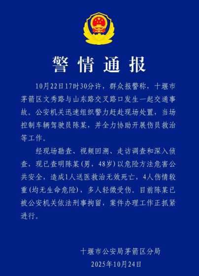 10月25日凌晨,湖北省十堰市公安局茅箭區(qū)分局發(fā)布警情通報:10月22日17時30分許,群眾報警稱,十堰市茅箭區(qū)文秀路與山東路交叉路口發(fā)生一起交通事故。公安機關迅速組織警力趕赴現場處置,當場控制車輛駕駛員陳某,并全力協助開展傷員救治等工作。