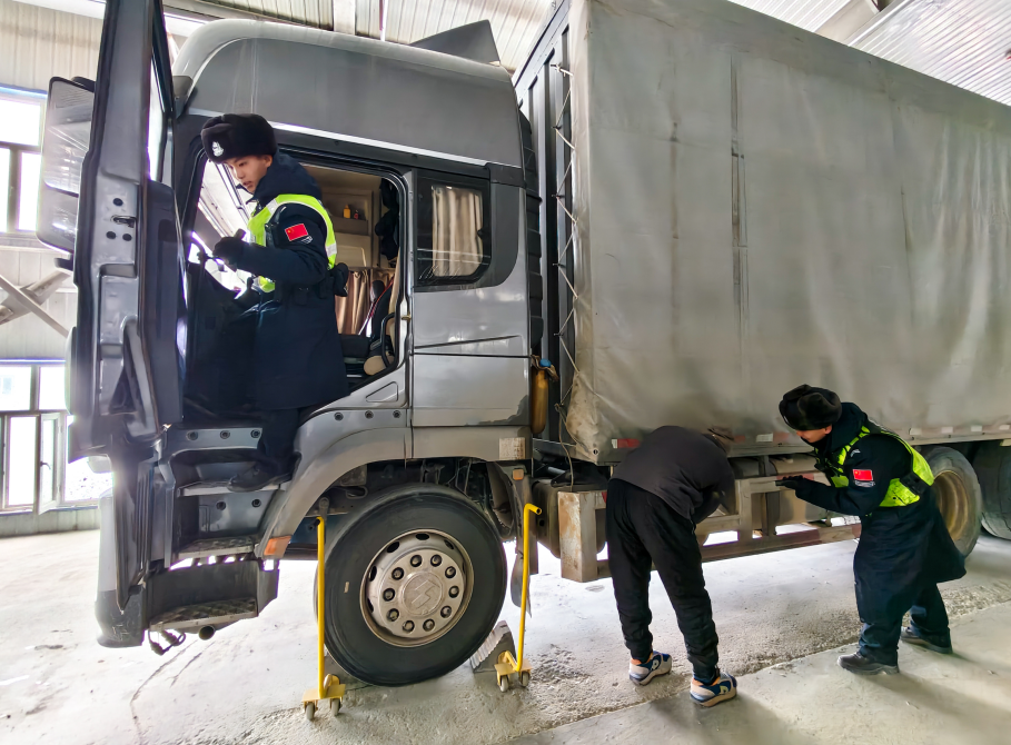 圖為執(zhí)勤民警查驗(yàn)出境貨車并進(jìn)行人證比對。
