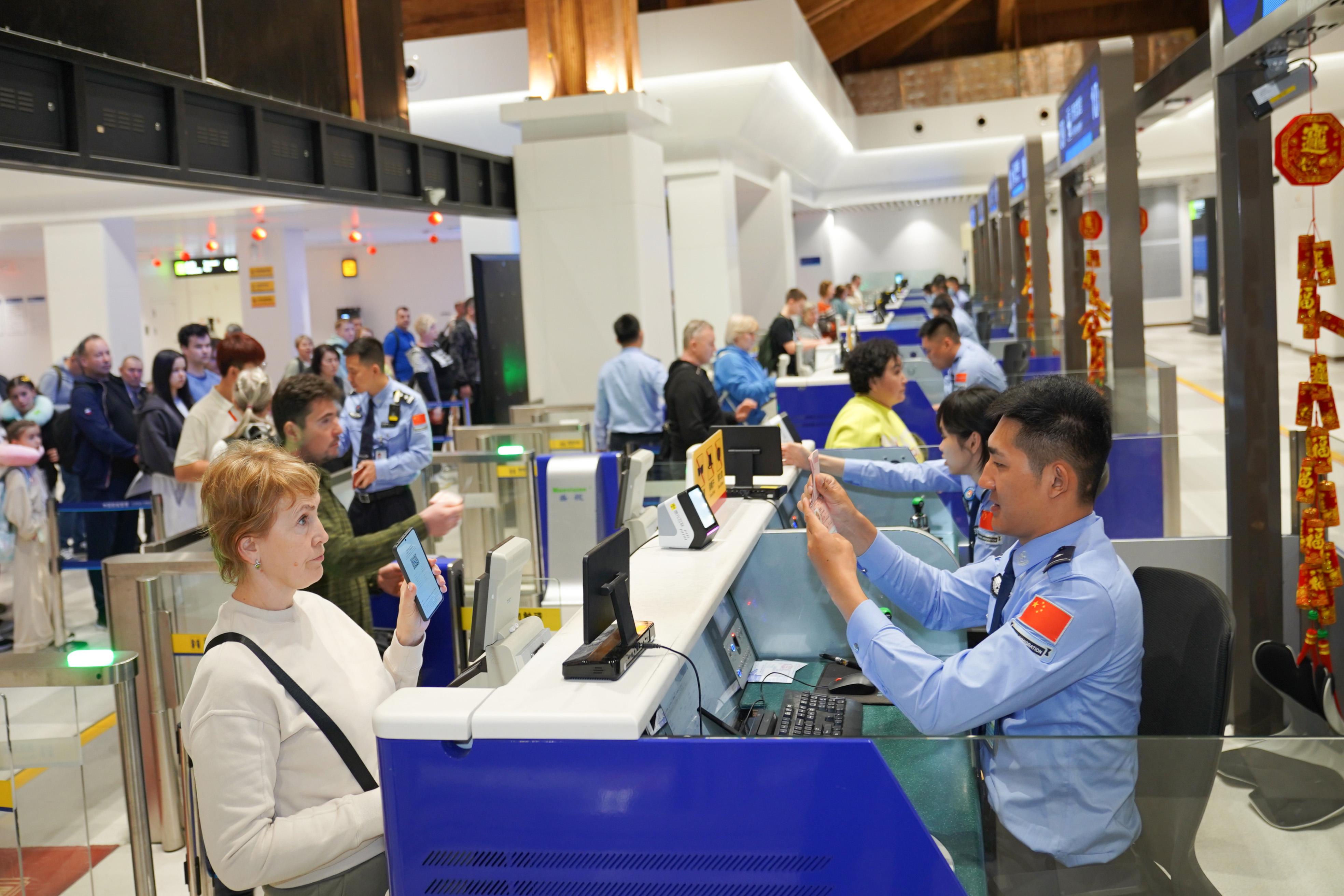 記者看到,短短一小時內,數百名外籍旅客涌入口岸,瞬時迎來春運首日客流高峰。