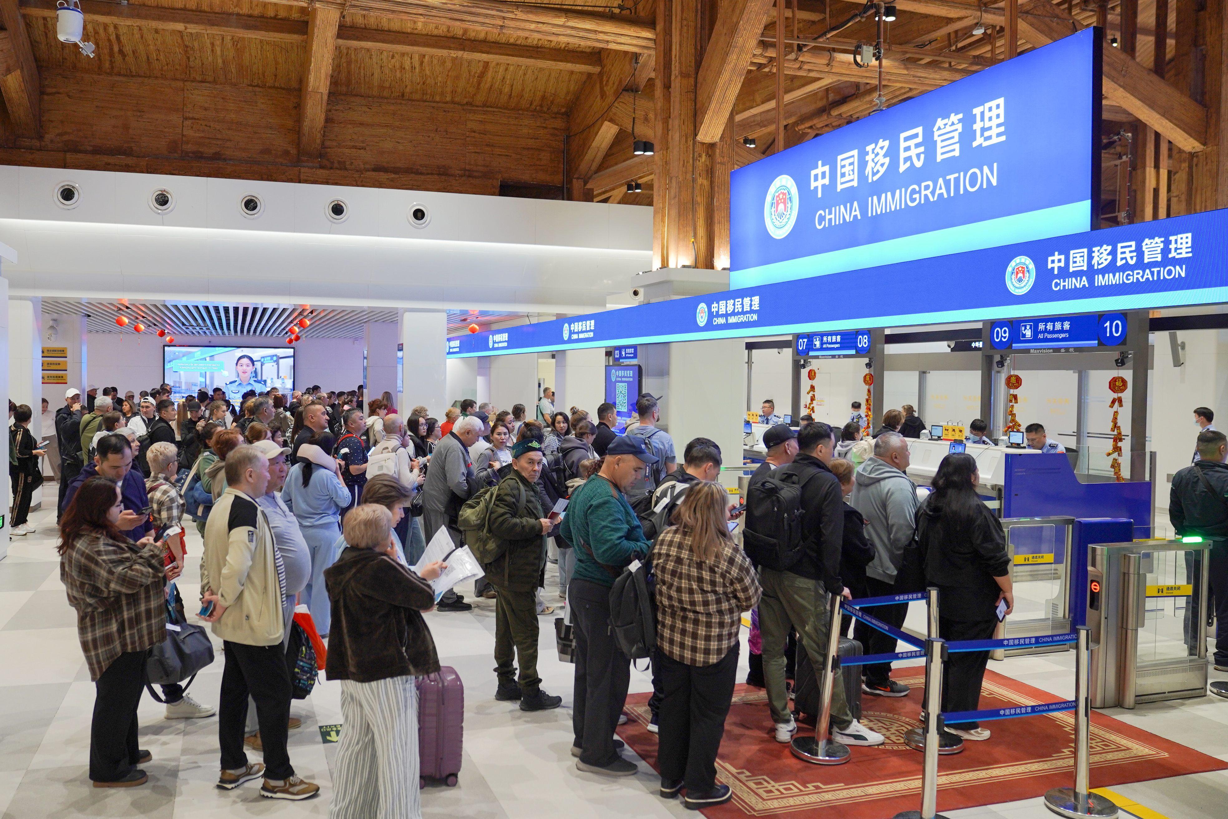 “謝—謝—!”一位正在辦理出境手續(xù)的俄羅斯旅客,耐心教懷抱中的孩子用中文向民警表達謝意。在這里,許多俄羅斯旅客即便不會說英語,也能熟練用中文說一句“謝謝”。