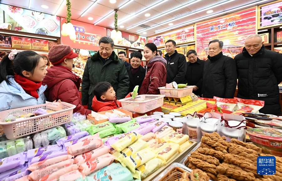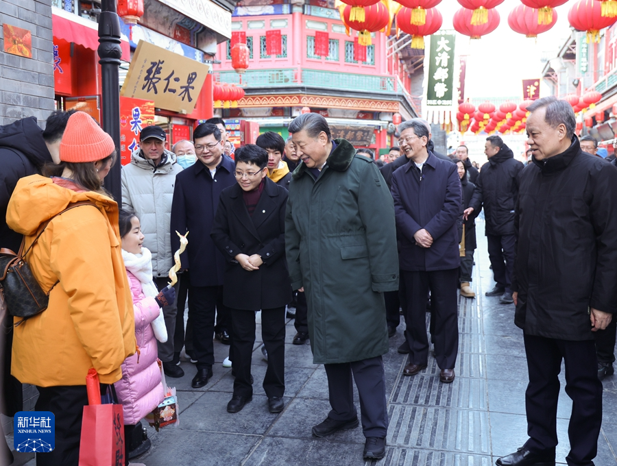 當(dāng)天下午,習(xí)近平來(lái)到天津古文化街。街道古色古香,習(xí)近平沿街步行,先后走進(jìn)桂發(fā)祥十八街麻花、果仁張、泥人張、楊柳青年畫(huà)等特色店鋪,了解產(chǎn)品種類(lèi)、銷(xiāo)售和傳統(tǒng)文化傳承發(fā)展等情況,同店鋪業(yè)主、員工和現(xiàn)場(chǎng)群眾互動(dòng)交流。他說(shuō),各級(jí)黨委和政府要加強(qiáng)節(jié)日期間民生商品的產(chǎn)銷(xiāo)保供,確保數(shù)量充足、品類(lèi)豐富、質(zhì)量可靠,讓廣大群眾放心消費(fèi)、快樂(lè)過(guò)年。習(xí)近平指出,中國(guó)式現(xiàn)代化離不開(kāi)優(yōu)秀傳統(tǒng)文化的繼承和弘揚(yáng),天津是一座很有特色和韻味的城市,要保護(hù)和利用好歷史文化街區(qū),使其在現(xiàn)代化大都市建設(shè)中綻放異彩。
