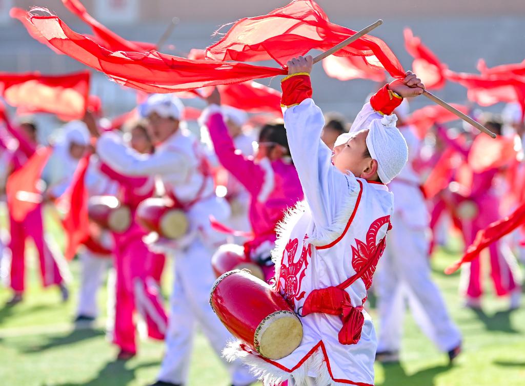 2023年11月16日,內(nèi)蒙古鄂爾多斯市鄂托克前旗第二小學的學生在大課間表演安塞腰鼓。該校將安塞腰鼓列入學校的校本課程和大課間活動,聘請民間藝人傳授技藝,讓非遺文化在校園中傳承。新華社發(fā)(王正攝)