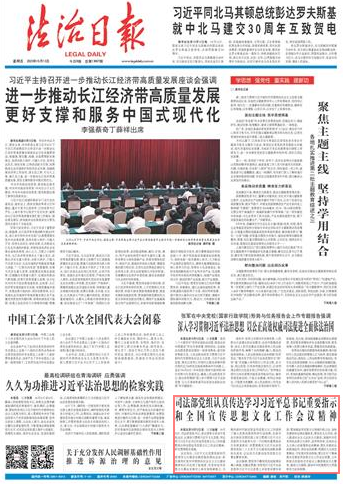 會(huì)議強(qiáng)調(diào),要堅(jiān)持不懈用黨的創(chuàng)新理論凝心鑄魂,在融會(huì)貫通、學(xué)悟篤行習(xí)近平法治思想和習(xí)近平文化思想上采取更多硬實(shí)舉措。要加強(qiáng)宣傳思想文化領(lǐng)域行政立法,加快完善相關(guān)法律法規(guī)體系。要堅(jiān)定文化自信,深入推進(jìn)社會(huì)主義法治文化建設(shè),加強(qiáng)中華優(yōu)秀傳統(tǒng)法律文化保護(hù)、宣傳和傳承,弘揚(yáng)社會(huì)主義核心價(jià)值觀和法治精神。要扎實(shí)做好法治新聞宣傳,講好法治故事,鞏固壯大主流思想輿論,守好意識(shí)形態(tài)陣地。要以釘釘子精神落實(shí)全國(guó)宣傳思想文化工作會(huì)議部署,立足職能為在新的歷史起點(diǎn)上繼續(xù)推動(dòng)文化繁榮、建設(shè)文化強(qiáng)國(guó)、建設(shè)中華民族現(xiàn)代文明提供有力法治保障。