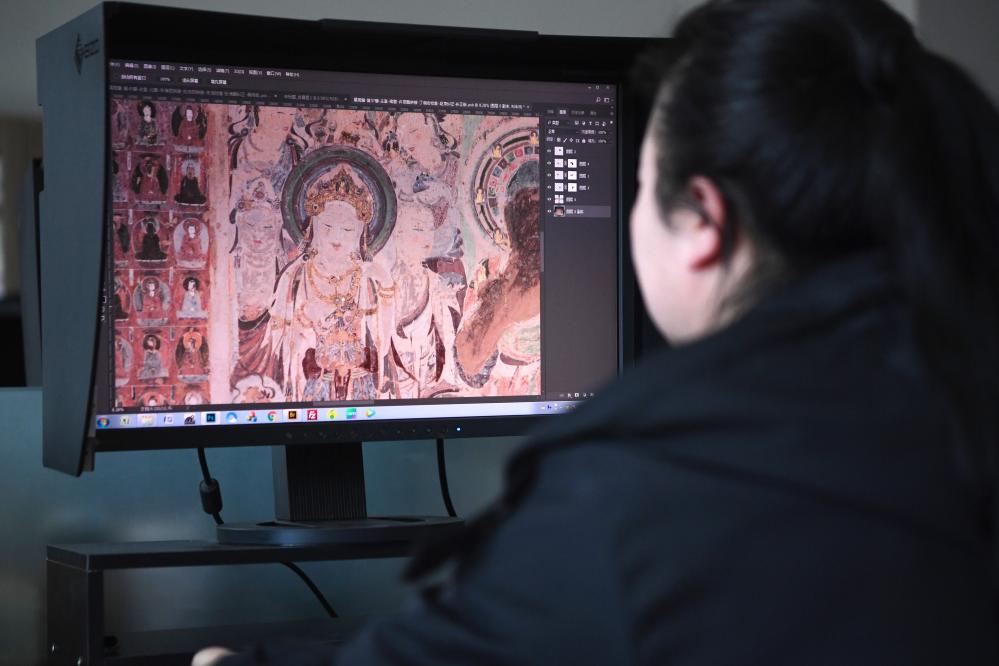 敦煌研究院文物數(shù)字化保護(hù)團(tuán)隊(duì)成員在拼接壁畫圖像(2023年4月25日攝)。新華社記者 陳斌 攝