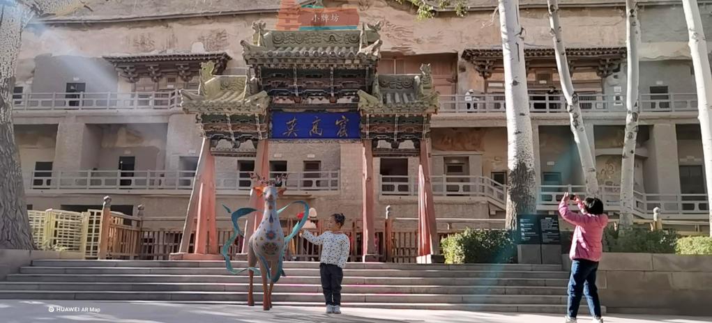 置身莫高窟,拿出手機(jī),身披絲帶的九色鹿竟從壁畫中“飛身而下”。摸摸它,乖巧的小鹿還會(huì)輕扭身體,與人互動(dòng)。人、實(shí)體洞窟和虛擬畫面三者同時(shí)出現(xiàn)在鏡頭里,常令游客倍感新奇。