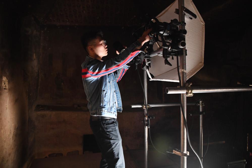 敦煌研究院文物數(shù)字化保護(hù)團(tuán)隊(duì)成員在洞窟內(nèi)調(diào)試設(shè)備,準(zhǔn)備進(jìn)行壁畫圖像采集(2023年4月25日攝)。新華社記者 陳斌 攝