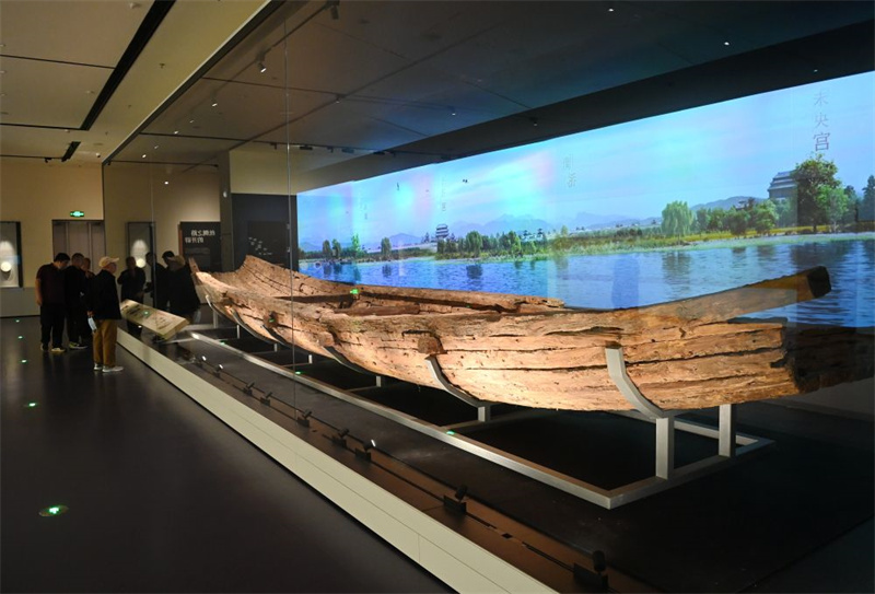 2024年5月6日,觀眾在陜西歷史博物館秦漢館參觀文物漢代古船“絲路一號”。新華社記者 李一博 攝