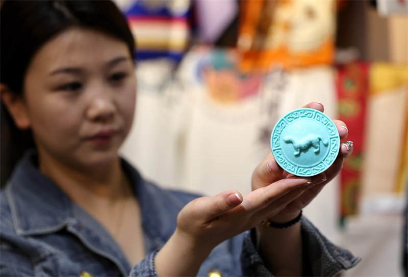 2024年4月23日,秦漢新城新絲路數(shù)字文化科技有限公司的工作人員展示一款由杜虎符開發(fā)而成的文創(chuàng)手工皂。新華社記者 李一博 攝