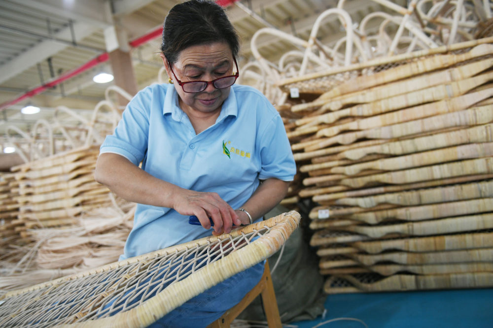 2023年9月7日,在位于漢中市的陜西良順匠心實業(yè)有限公司,工作人員在編織藤制品。新華社記者 張曼怡 攝