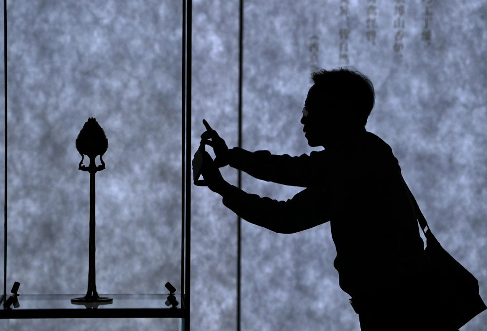 2024年5月18日,觀眾在陜西歷史博物館秦漢館觀看“技與美”專題陳列上展出的西漢鎏金銀竹節(jié)銅熏爐。新華社記者 李一博 攝