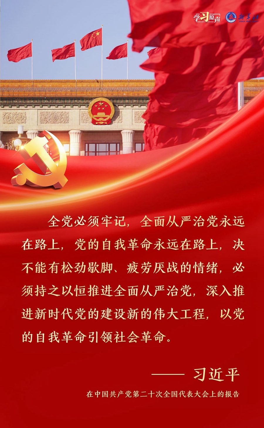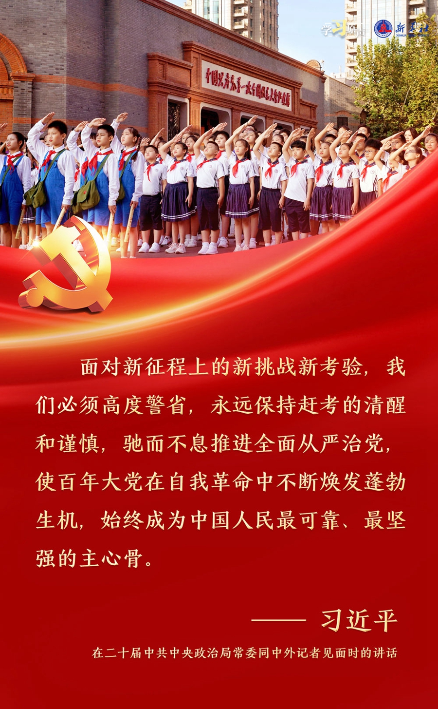 習(xí)近平總書記強(qiáng)調(diào),面對(duì)新征程上的新挑戰(zhàn)新考驗(yàn),我們必須高度警省,永遠(yuǎn)保持趕考的清醒和謹(jǐn)慎,馳而不息推進(jìn)全面從嚴(yán)治黨,使百年大黨在自我革命中不斷煥發(fā)蓬勃生機(jī),始終成為中國人民最可靠、最堅(jiān)強(qiáng)的主心骨。