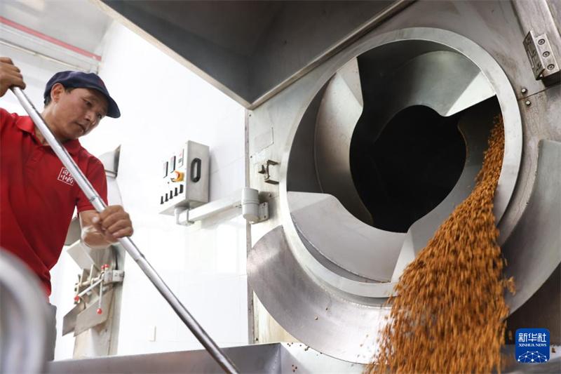 7月22日,工作人員在甘肅天水市甘谷縣安遠(yuǎn)鎮(zhèn)大城村的辣椒烘干和加工車間操作石碾研磨辣椒?!⌒氯A社記者 呂帥 攝