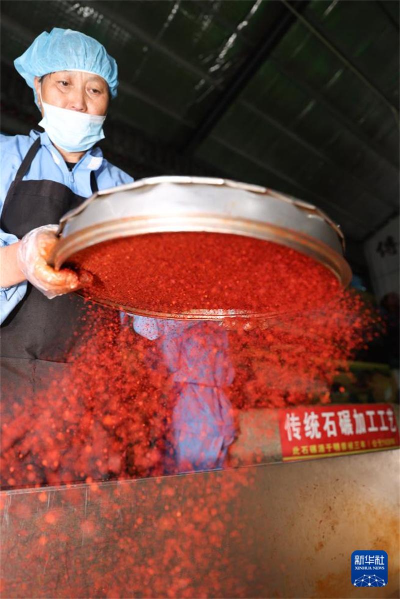 7月22日,工作人員在甘肅天水市甘谷縣安遠(yuǎn)鎮(zhèn)大城村的辣椒烘干和加工車間操作石碾研磨辣椒。 新華社記者 呂帥 攝