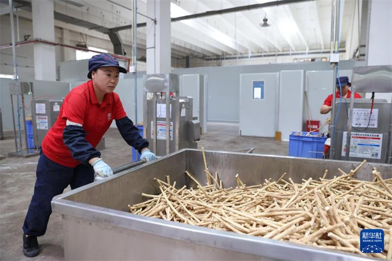 7月23日,工作人員在甘肅隴西縣的一家藥材公司的車間加工黃芪。 新華社記者 呂帥 攝