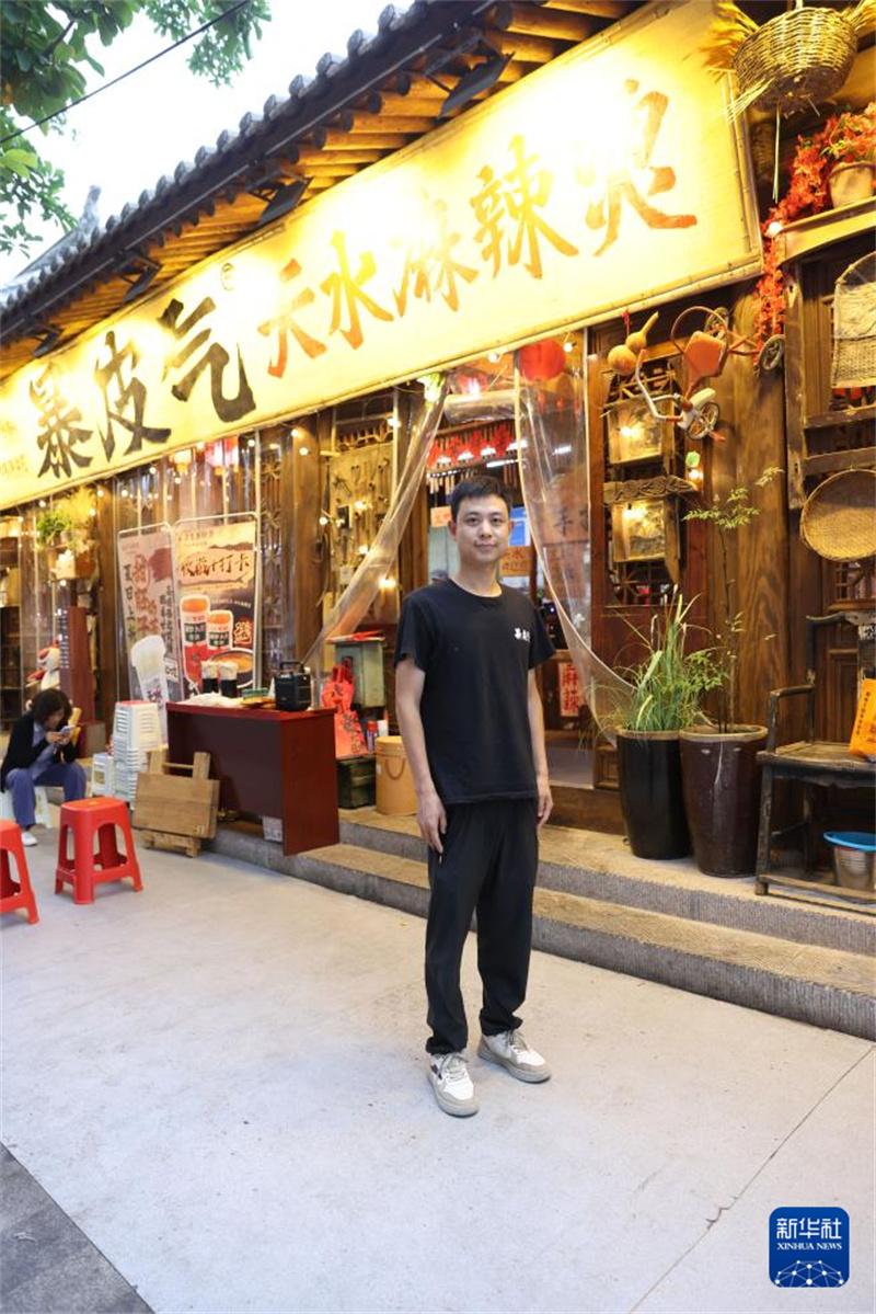 7月22日,經(jīng)營麻辣燙店10多年的商戶郝二龍?jiān)诟拭C天水古城的一家麻辣燙店門前?!⌒氯A社記者 呂帥 攝