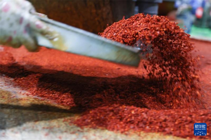 7月22日,工作人員在甘肅天水市甘谷縣安遠(yuǎn)鎮(zhèn)大城村的辣椒烘干和加工車間給辣椒粉過篩。 新華社記者 呂帥 攝