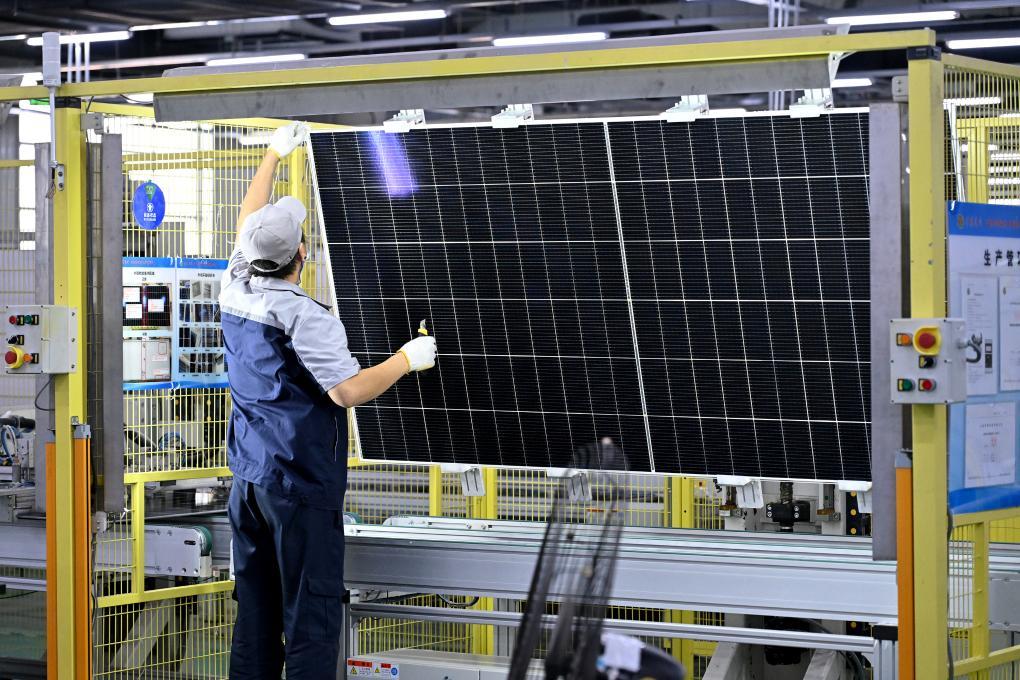 7月31日,山西省華陽新材料集團華儲光電有限公司的工作人員在光伏生產(chǎn)線的層后外觀檢環(huán)節(jié)進行組件檢驗,確認無氣泡、并片、漏光等不良現(xiàn)象。新華社記者 李鑫 攝