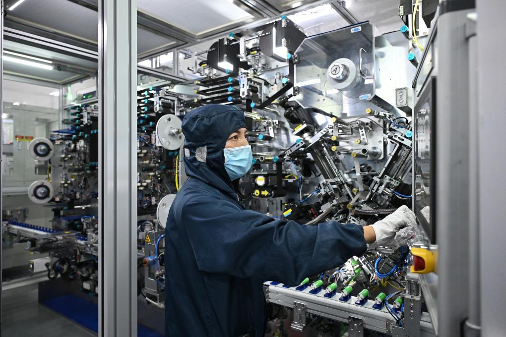 7月31日,華陽新材料科技集團華鈉芯能科技有限責任公司的工作人員在圓柱電芯制片卷繞機上操控設備運行。新華社記者 李鑫 攝