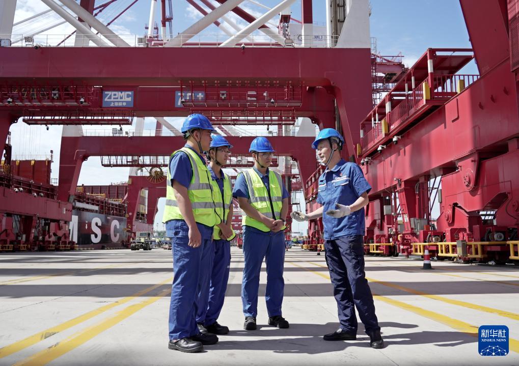 許振超(右一)和團(tuán)隊(duì)成員在碼頭研究傳統(tǒng)集裝箱橋吊的智能化升級(jí)方案(9月2日攝)。新華社發(fā)(閆軍攝)