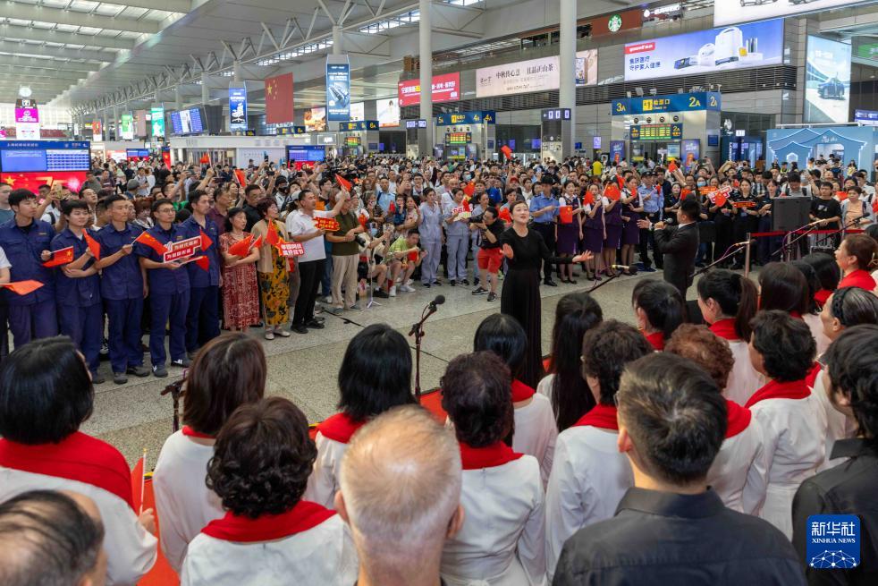 9月28日,鐵路上海站聯(lián)合中國上海國際藝術(shù)節(jié)中心在上海虹橋站候車室開展迎國慶快閃活動,演員在活動中演唱歌曲。