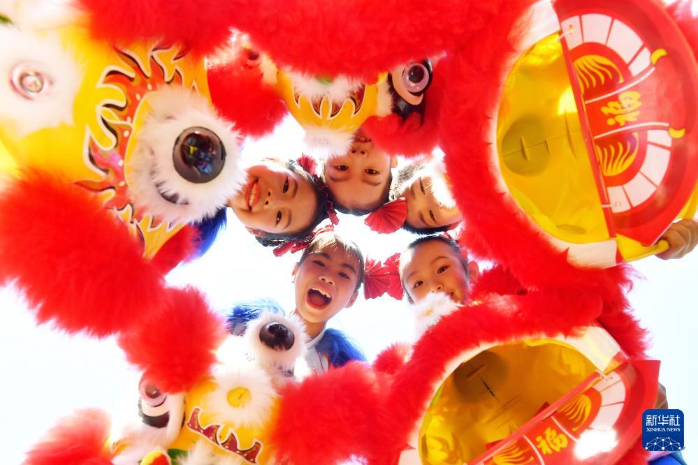 9月27日,在山東青島北仲路第一小學(xué)開展的國慶主題系列活動上,小學(xué)生在表演獅子舞。