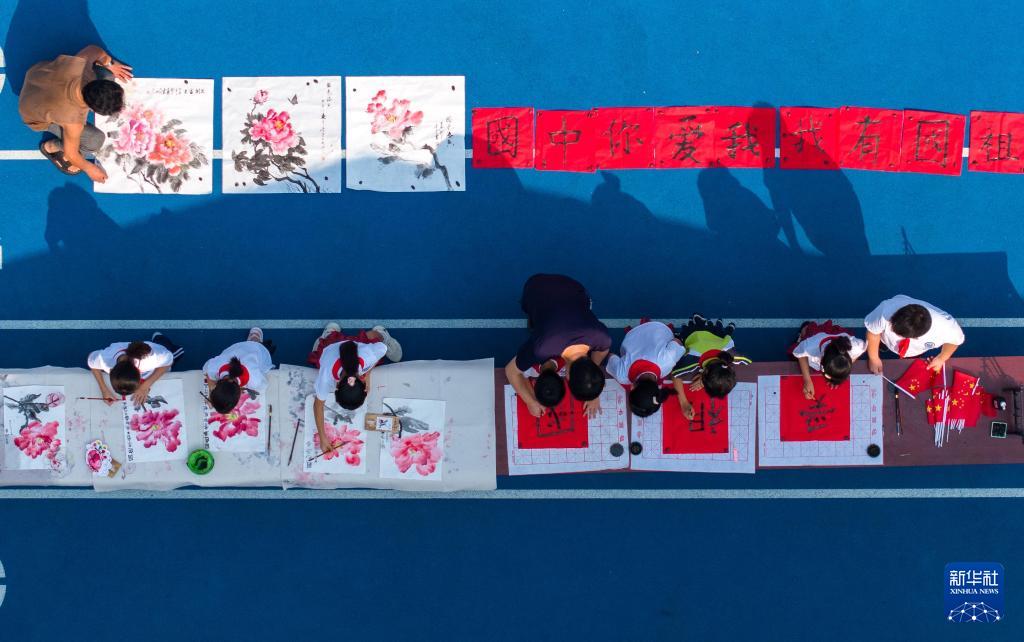 9月27日,在四川省眉山市彭山區(qū)鵬利小學(xué),學(xué)生通過書法和繪畫表達(dá)對(duì)祖國的祝福(無人機(jī)照片)。