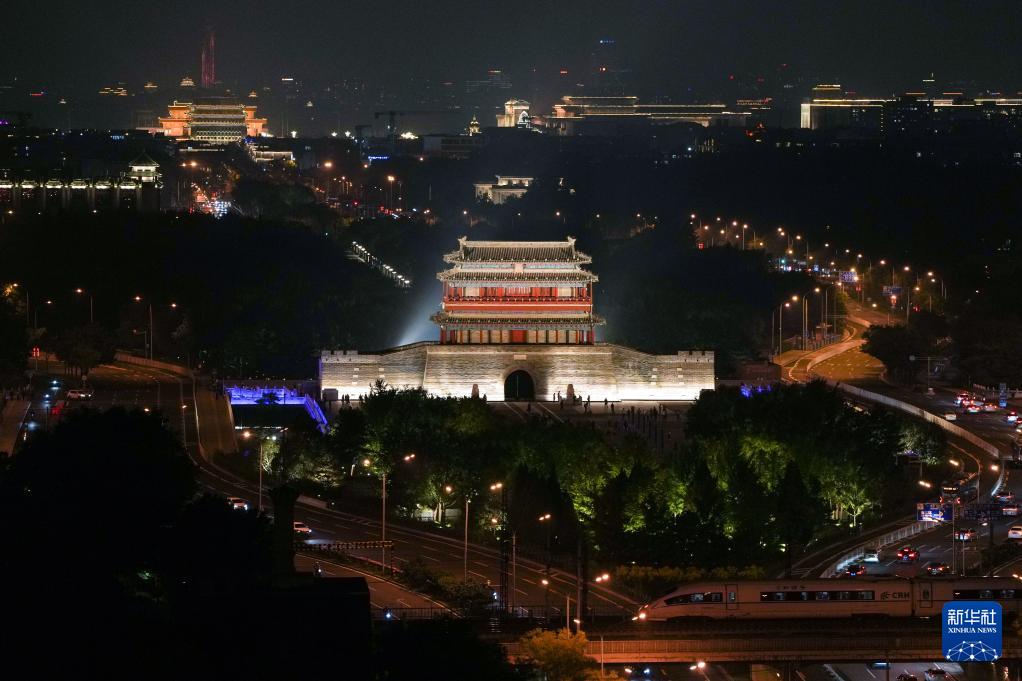 9月26日拍攝的完成景觀照明設(shè)施提升后亮燈的永定門城樓和中軸線上的建筑。