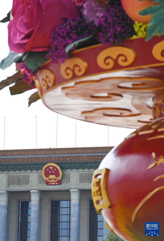 9月25日拍攝的天安門廣場(chǎng)“祝福祖國(guó)”巨型花籃與人民大會(huì)堂。