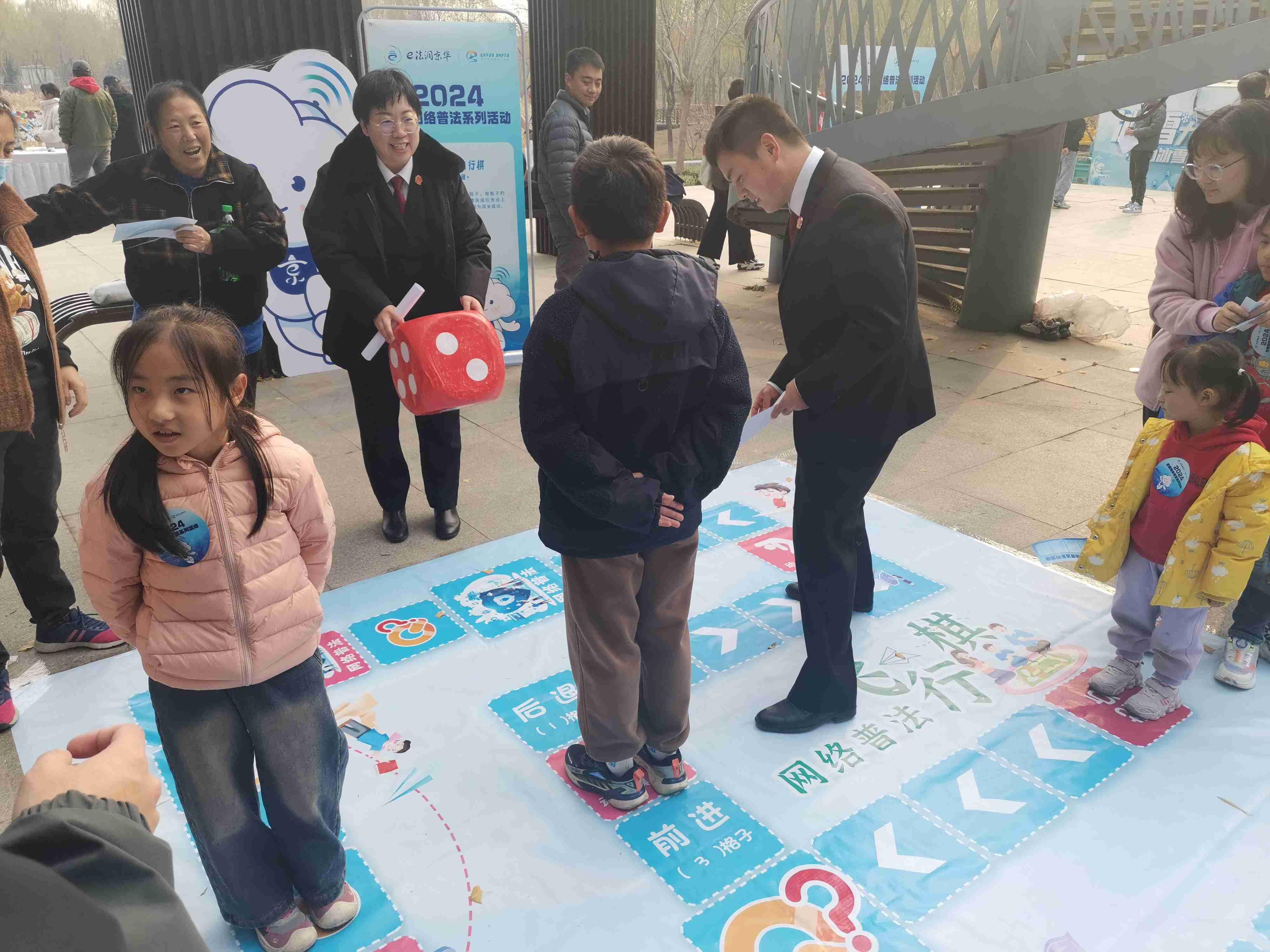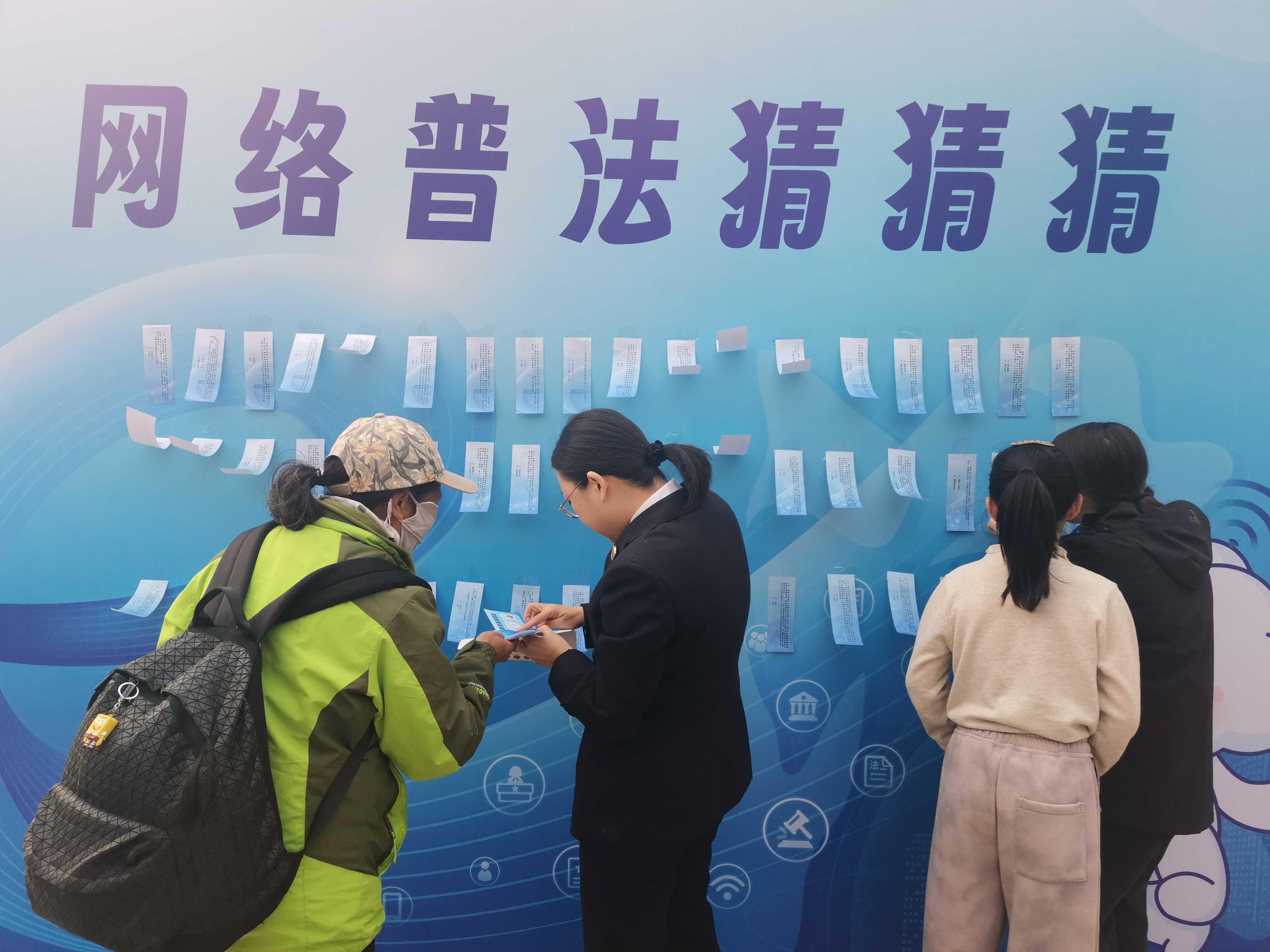 猜謎語、繪圖畫、拼拼圖、玩游戲……11月9日下午,北京市通州區(qū)臺湖公園內(nèi)人聲鼎沸、熱鬧非凡,由北京市委網(wǎng)信辦主辦,通州區(qū)委網(wǎng)信辦承辦,通州區(qū)人民法院、通州區(qū)人民檢察院、通州區(qū)教委以及臺湖鎮(zhèn)人民政府協(xié)辦的“e法潤京華·運河平安獸 護網(wǎng)凈萬家”網(wǎng)絡(luò)普法游園會正如火如荼地進行。記者在現(xiàn)場看到,人們駐足觀看普法短劇并爭相和劇中的小主人公合影、在普法展板前聽檢察官以案講法、在網(wǎng)絡(luò)普法像框墻前打卡留念,在手繪布上畫下對網(wǎng)絡(luò)安全和文明上網(wǎng)的理解與期盼。而現(xiàn)場設(shè)置的網(wǎng)絡(luò)普法猜猜猜、普法拼圖大挑戰(zhàn)、網(wǎng)絡(luò)普法飛行棋等闖關(guān)游戲更是引起眾多小朋友的興趣和熱情,每個游戲區(qū)前都排起了長隊,在歡聲笑語中,針對未成年人的網(wǎng)絡(luò)保護知識也在孩子們心中扎根發(fā)芽。