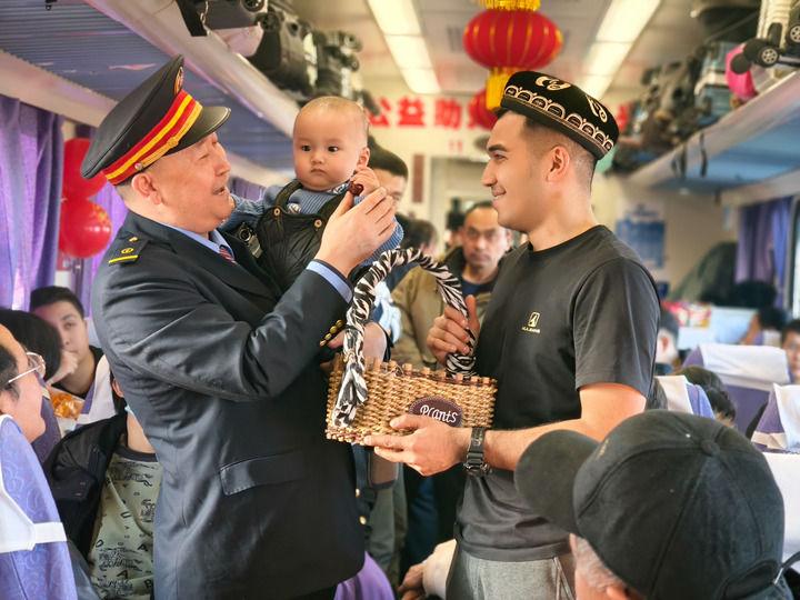 “列車巴扎開市啦!”1月25日早9點,祖國大西北,7558次“和田玉龍?zhí)枴绷熊囬_出新疆和田站。沒多久,12號車廂里就傳來列車長坡拉提汗的吆喝聲。車廂里立馬熱鬧起來,售賣農副產品的吆喝聲、旅客的笑聲和交談聲奏響了歡樂的旋律……