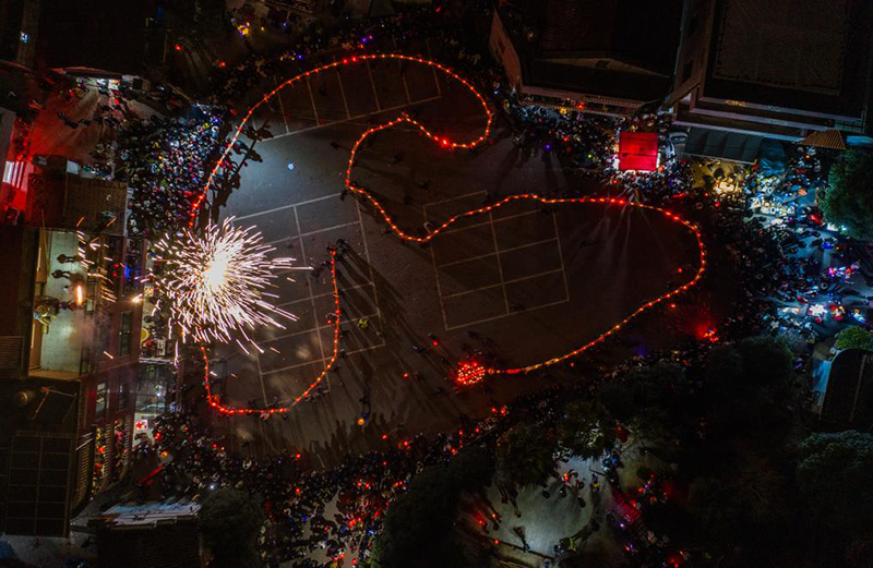 2月10日,赤松鎮(zhèn)虎巖村村民抬著板凳龍,開始進(jìn)行晚上的巡游(無人機(jī)照片)。新華社記者徐昱 攝