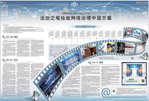 協調重要報道力量,采寫《中國網絡法治健步走過三十年法治之筆繪就網絡治理中國方案》報紙專版稿件,采用通版對開形式呈現。綜述文章雋永厚重,版面視覺效果恢弘大氣,圖文并茂地對《中國網絡法治三十年》報告進行了全面解讀,獲得全網廣泛傳播。在該專版中,既集納傳統(tǒng)的報紙通訊、記者手記等文字報道,又運用多種媒體元素、創(chuàng)新設計報紙版式。橫跨全版的“時光膠卷”一氣呵成,讓網絡法治建設三十年大事記躍然紙上。同時,放置新媒體“門票”海報,讓讀者沉浸式體驗網絡法治建設的歷史成就。