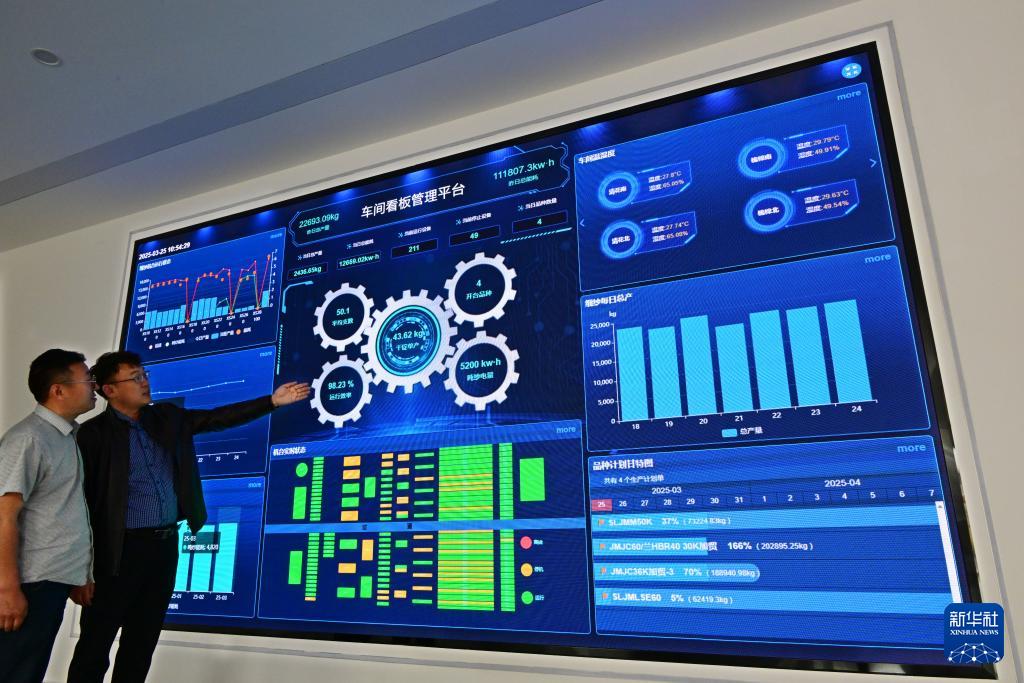 ??在即墨區(qū)龍山街道一家服裝企業(yè)的車間看板管理平臺,工作人員在實(shí)時查看相關(guān)數(shù)據(jù)(3月25日攝)。